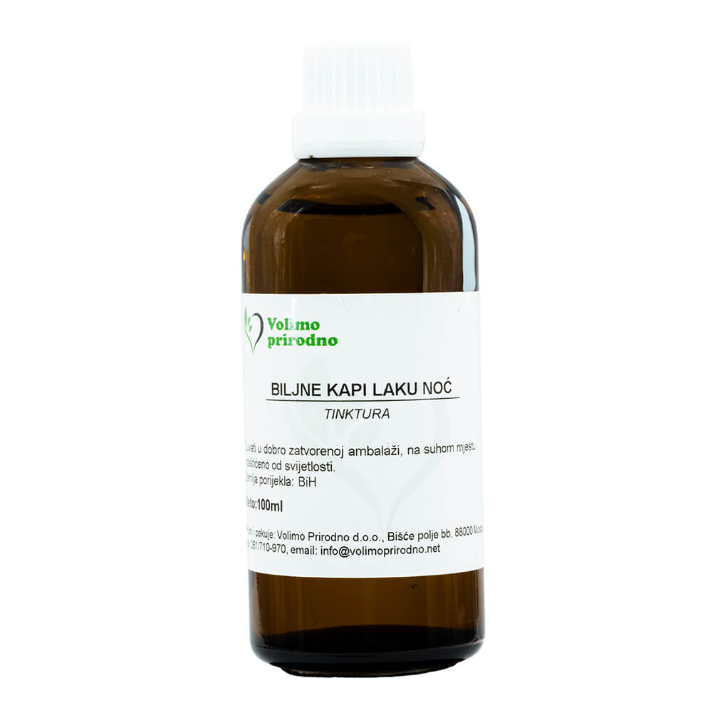 Opis: Naša tinktura odnosno biljne kapi za laku noć je pažljivo formulisan biljni ekstrakt, zasnovan na kombinaciji valerijane (korijen), hmelja (šišarice), matičnjaka (list) i lavande (cvijet) — biljaka koje se tradicionalno i naučno prepoznaju kao prirodni sedativi i sredstva za opuštanje. Ekstrakt je dobijen u etanolu i vodi, bez sintetičkih konzervansa, sa ciljem da pruži prirodnu podršku kod nesanice, nervoze i dnevnog stresa.